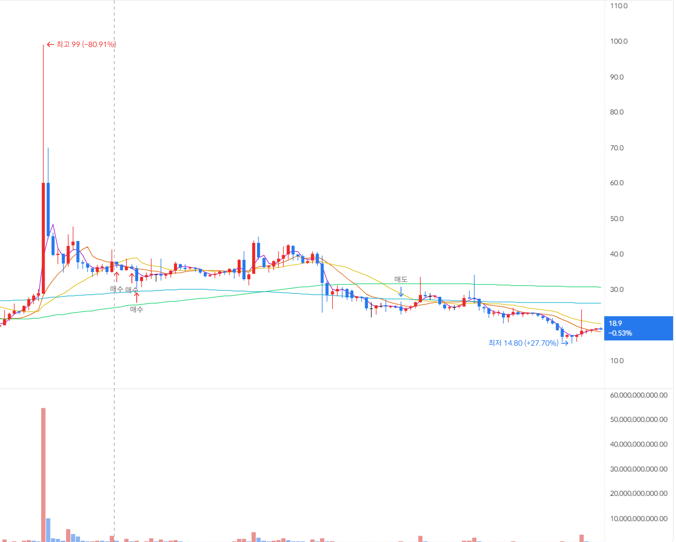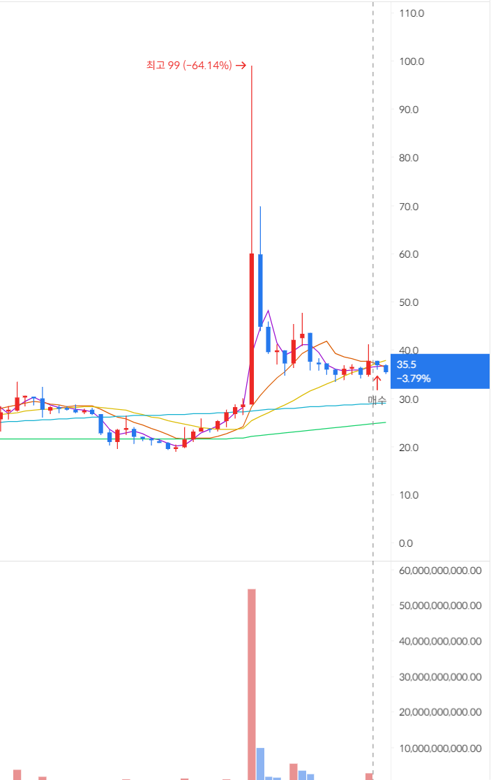 저때 한 번 익절 쳤어야했는데...거래량 저거 봐...저걸 봤으면 한 번 청산했을 거야..하지만 늘 부푼 꿈이 문제지