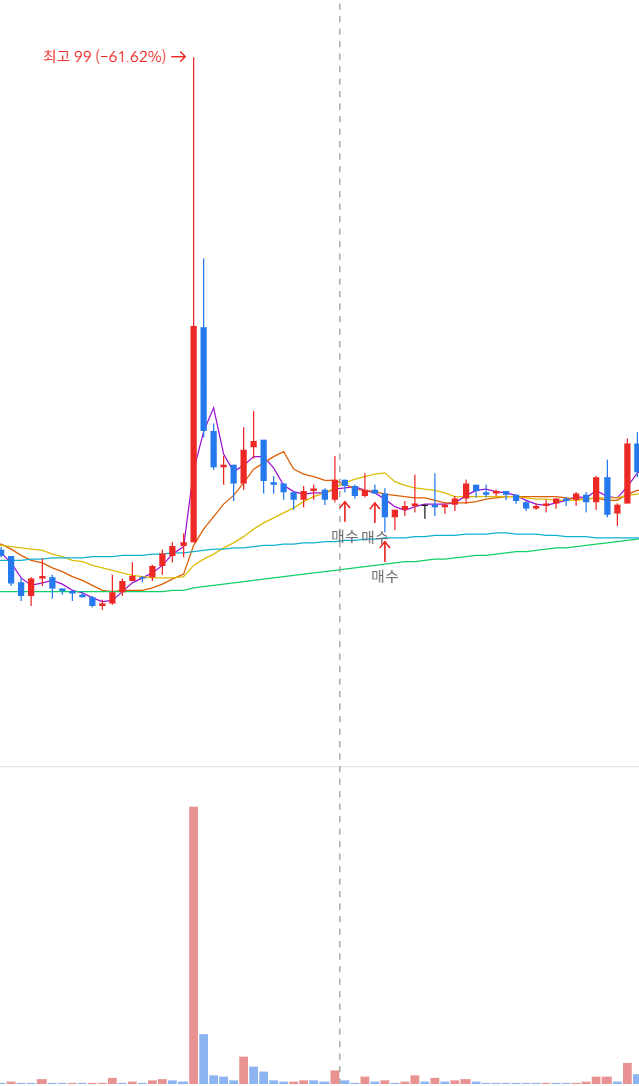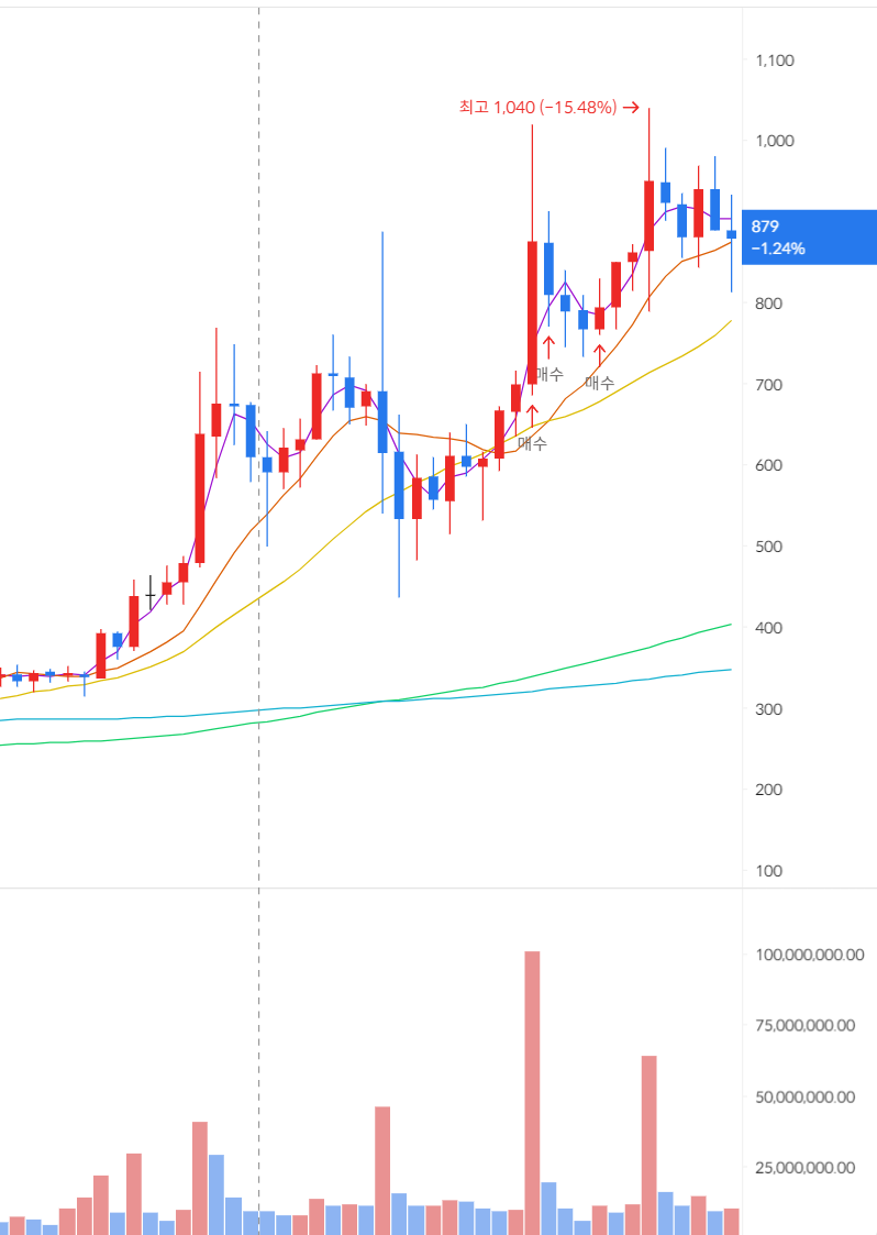 터지는 거래량을 확인하고 장대 양봉에서 과감히 매수 후 거래량이 뚝 떨어지면서 조정 받는 걸 확인하고 두 차례 더 매수 진행했습니다.