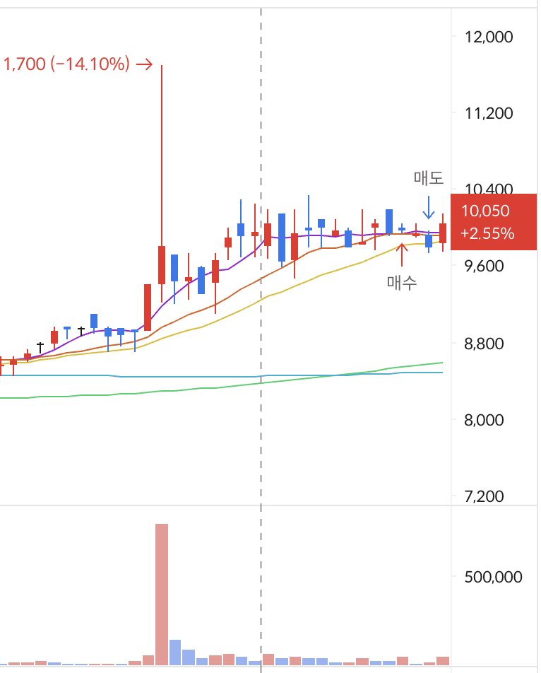 한번 급등 하면서 거래량 터진 후 거래량 훅 줄어들면서 횡보하길래 오 그래 조정 구간이군 하고 들어갔다.